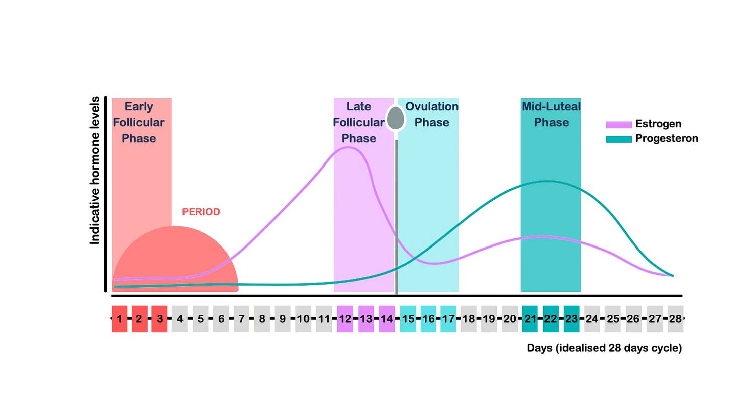 Women have to train and compete during different phases of the menstrual cycle, where hormonal fluctuations can theoretically affect both performance and training adaptations, but also mood, motivation and readiness. Simplified, the two main sex hormones in women – estrogen and progesterone – vary in concentration during the cycle. In regularly menstruating (also called “eumenorrheic”) women, these hormones rise and fall in a relatively predictable pattern, with cycle lengths typically ranging from 21 to 35 days (average 28), varying from woman to woman. A normal menstrual cycle begins with the menstrual (bleeding) phase, during which both estrogen and progesterone levels are low. Just before ovulation, around the middle of the cycle, estrogen peaks and is not yet influenced by progesterone. In the luteal phase – the second half of the cycle – both estrogen and progesterone levels are high (see illustration of a typical menstrual cycle below).