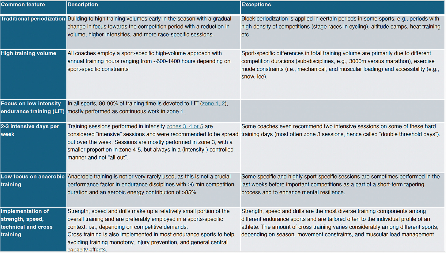 When observing the training processes of various successful athletes from different endurance sports, many common characteristics can be found. Several small-sample or case studies (ref) on some of the world’s most prominent endurance athletes have described these characteristics, noting that relatively high training volumes are typical. These studies found that approximately 80-90% of training is dedicated to low-intensity training (LIT), 10-15% to moderate-intensity (MIT) or high-intensity (HIT) training, and that strength training, skill training, and speed training are employed depending on the sport-specific demands. However, although these studies have provided valuable insights into the training characteristics of successful endurance athletes, they have not described the more conceptualized and holistic training process as designed by coaches.